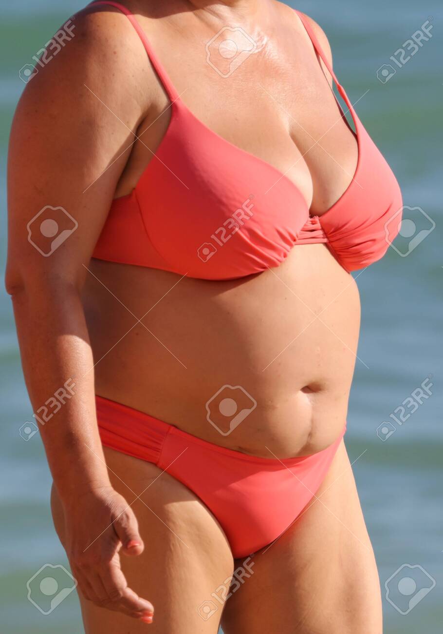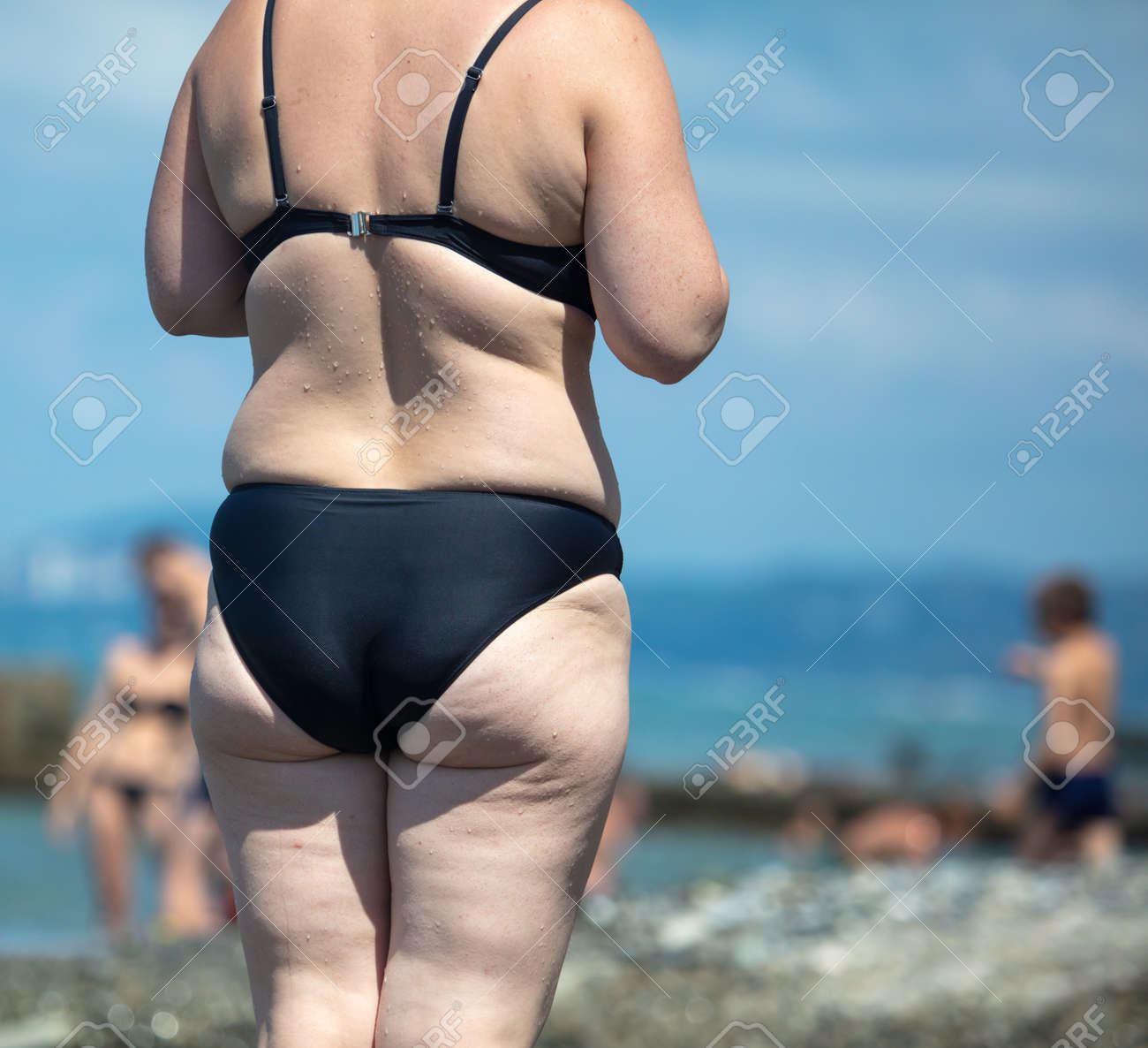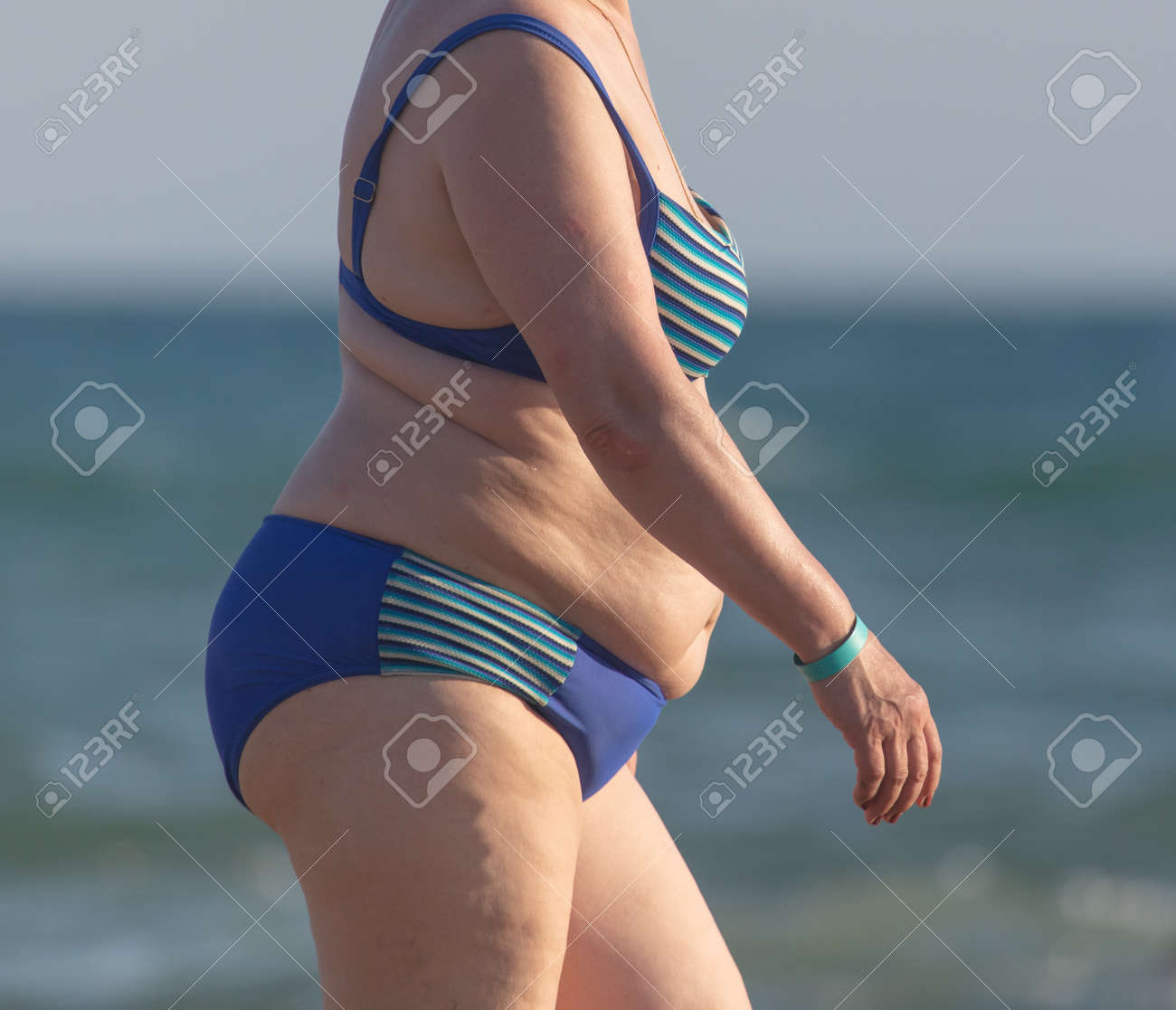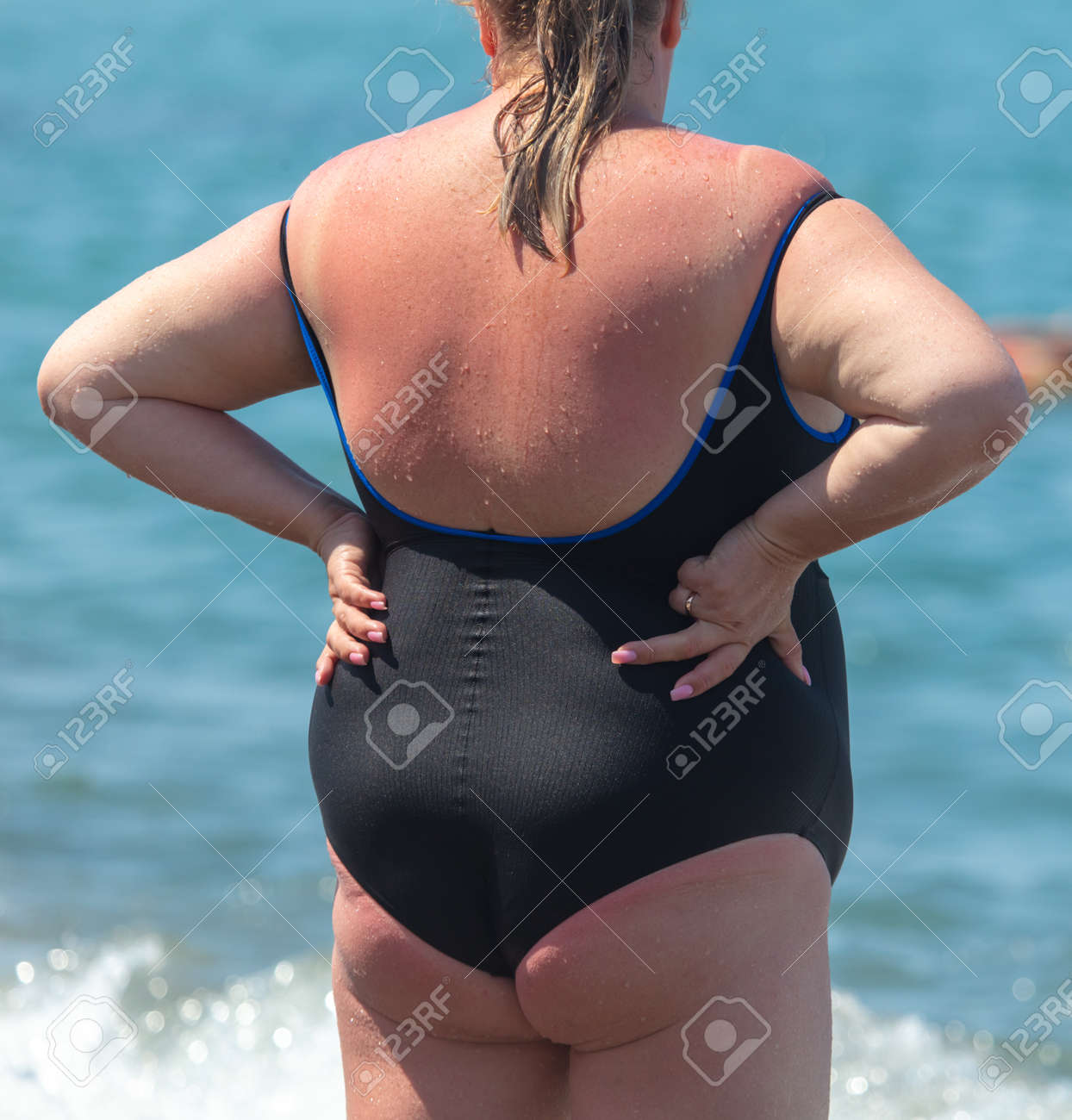 바다 해변에서 수영복을 입은 뚱뚱한 여자. 로열티 무료 사진, 그림 ...