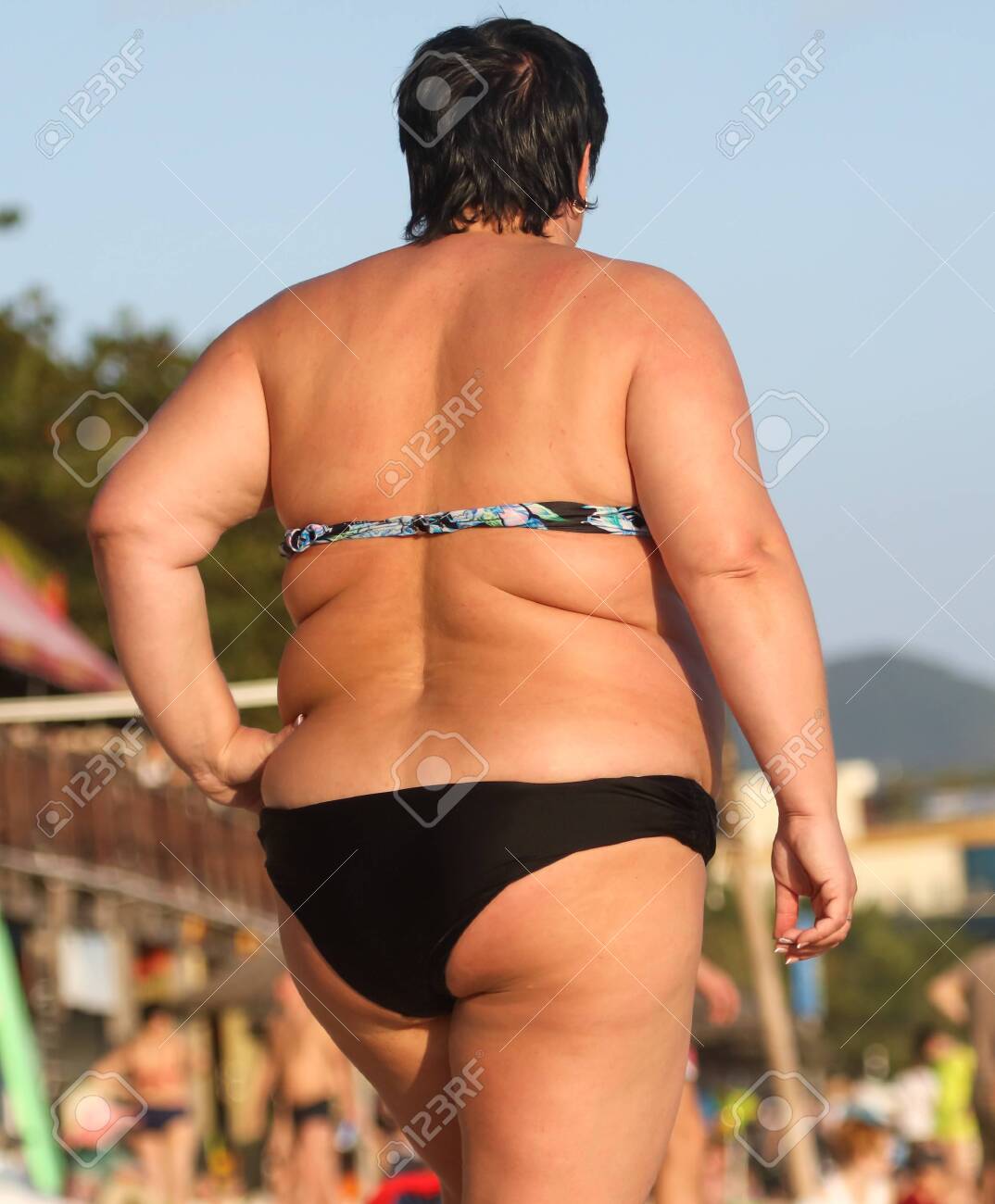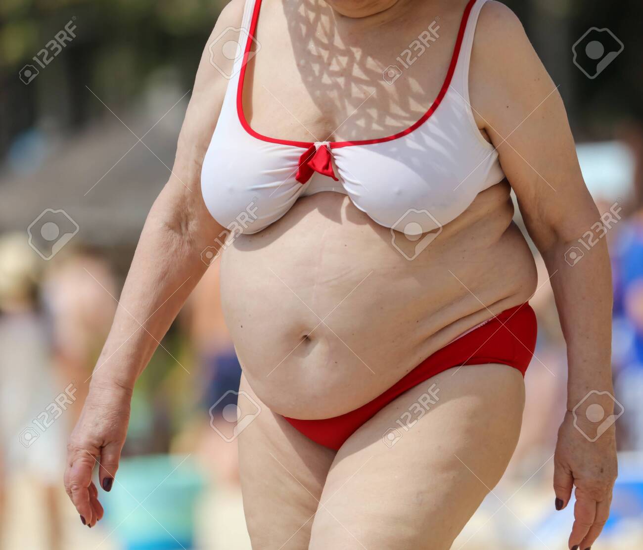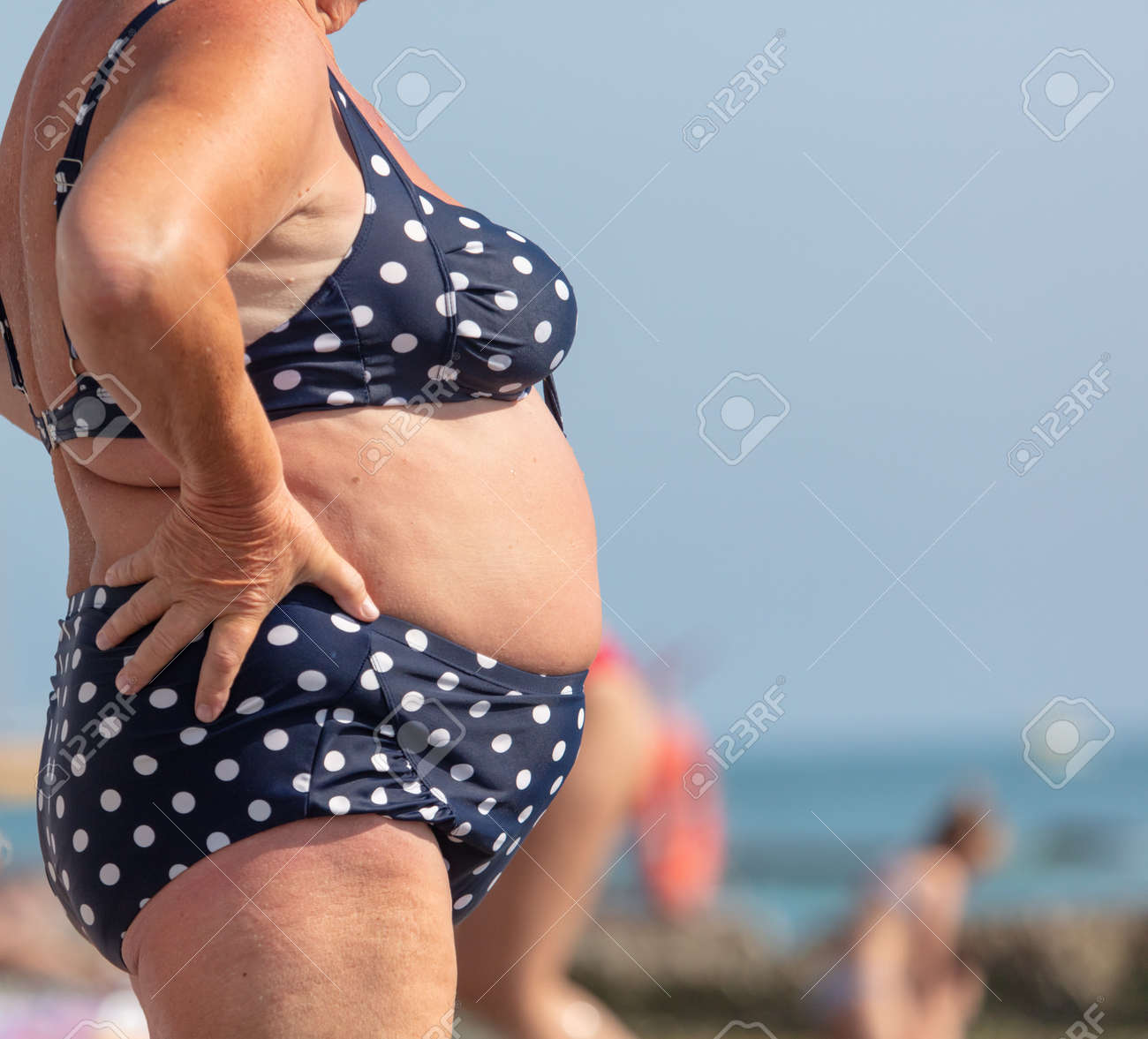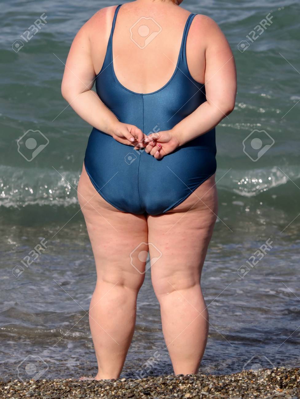 바다 해변에서 수영복을 입은 뚱뚱한 여자. 로열티 무료 사진, 그림 ...
