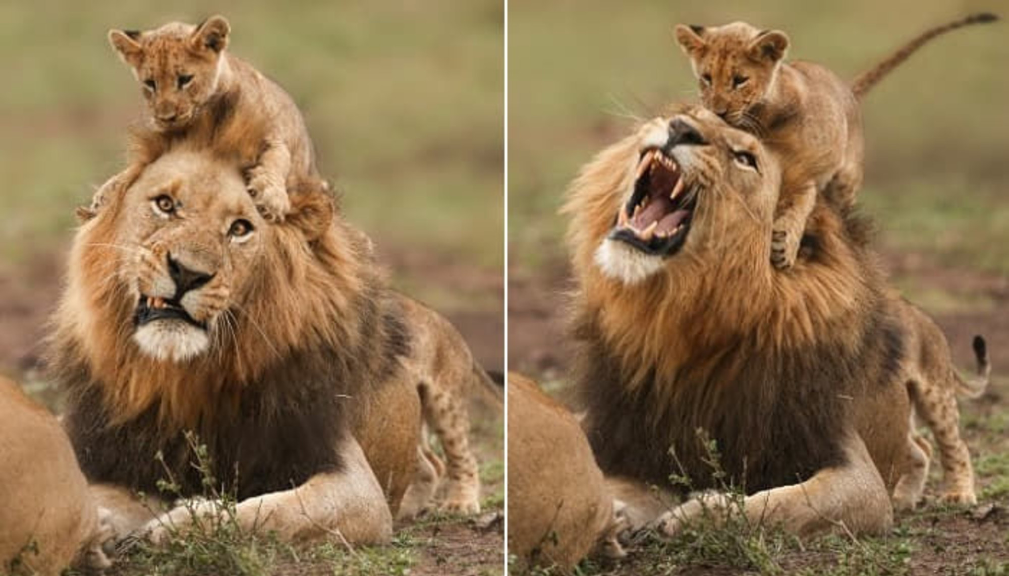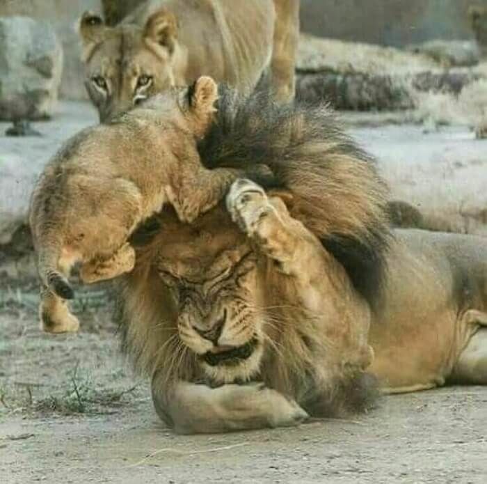 허락도 없이 등에 올라가 갈기 붙잡고 노는 새끼 사자에게 단단히 화난 ...