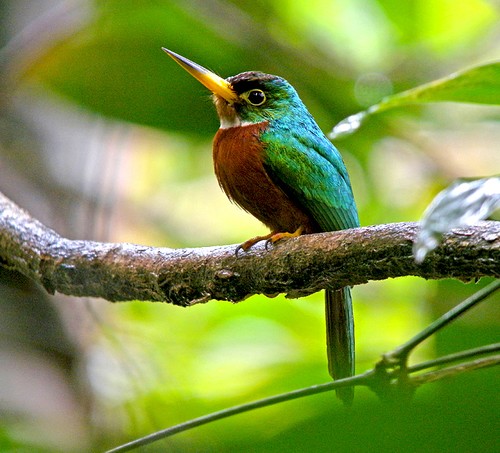Jacamar а bec jaune; German: Gelbschnabel-Glanzvogel; Spanish:
